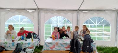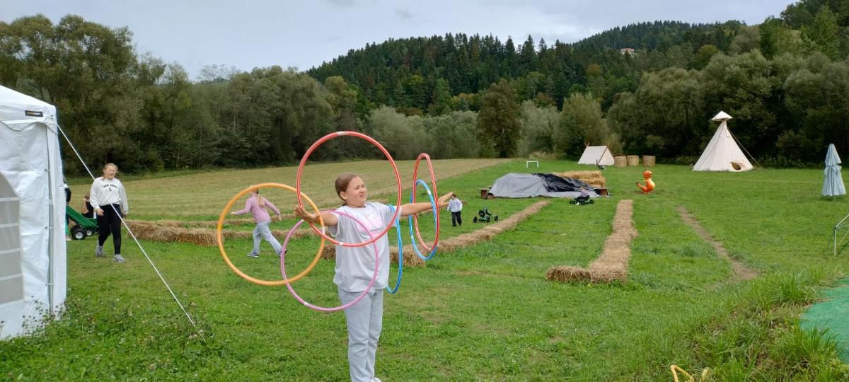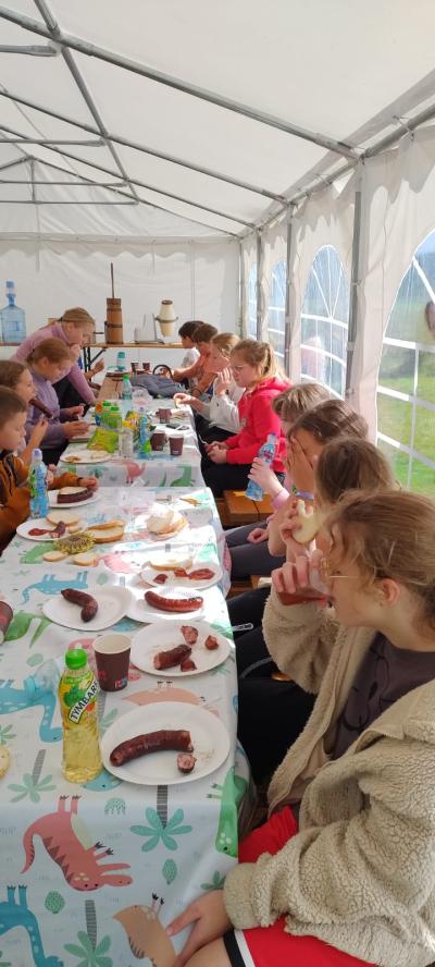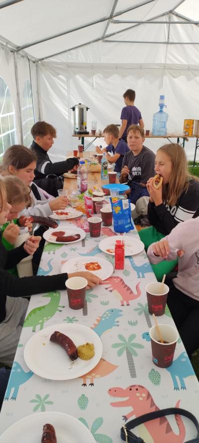Po kilku godzinach aktywności wszyscy zasiedli do wspólnego posiłku, delektując się pyszną kiełbaską z grilla. Mimo przelotnego deszczu był to dzień pełen radości, wzajemnej życzliwości i niezapomnianych wrażeń – wszyscy bawili się doskonale.