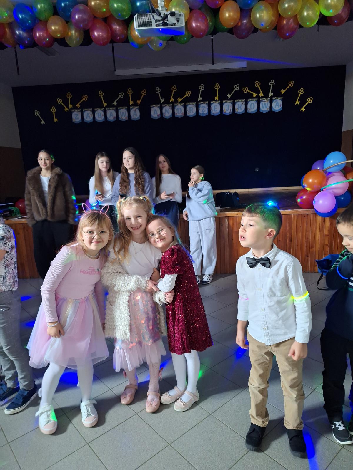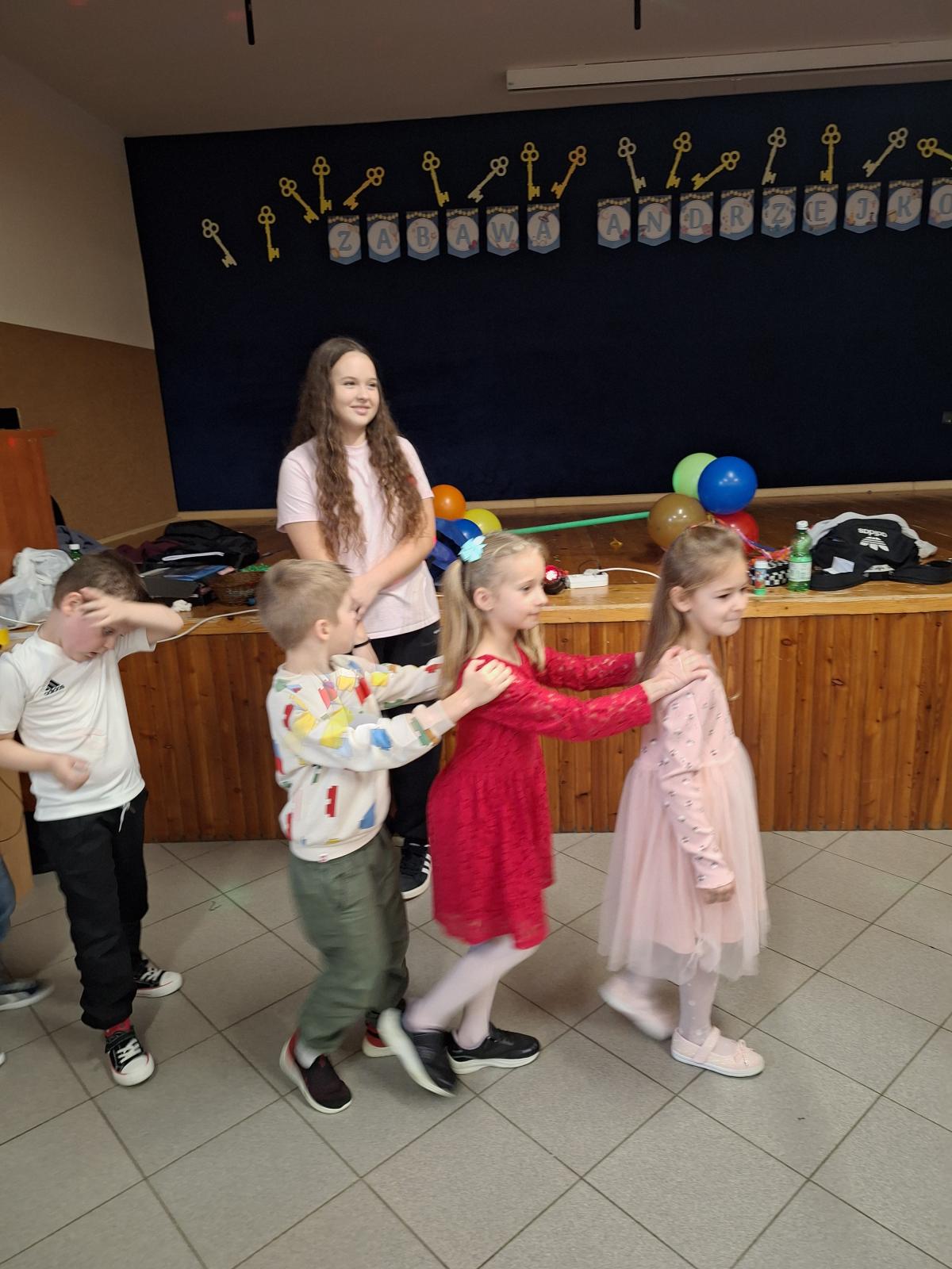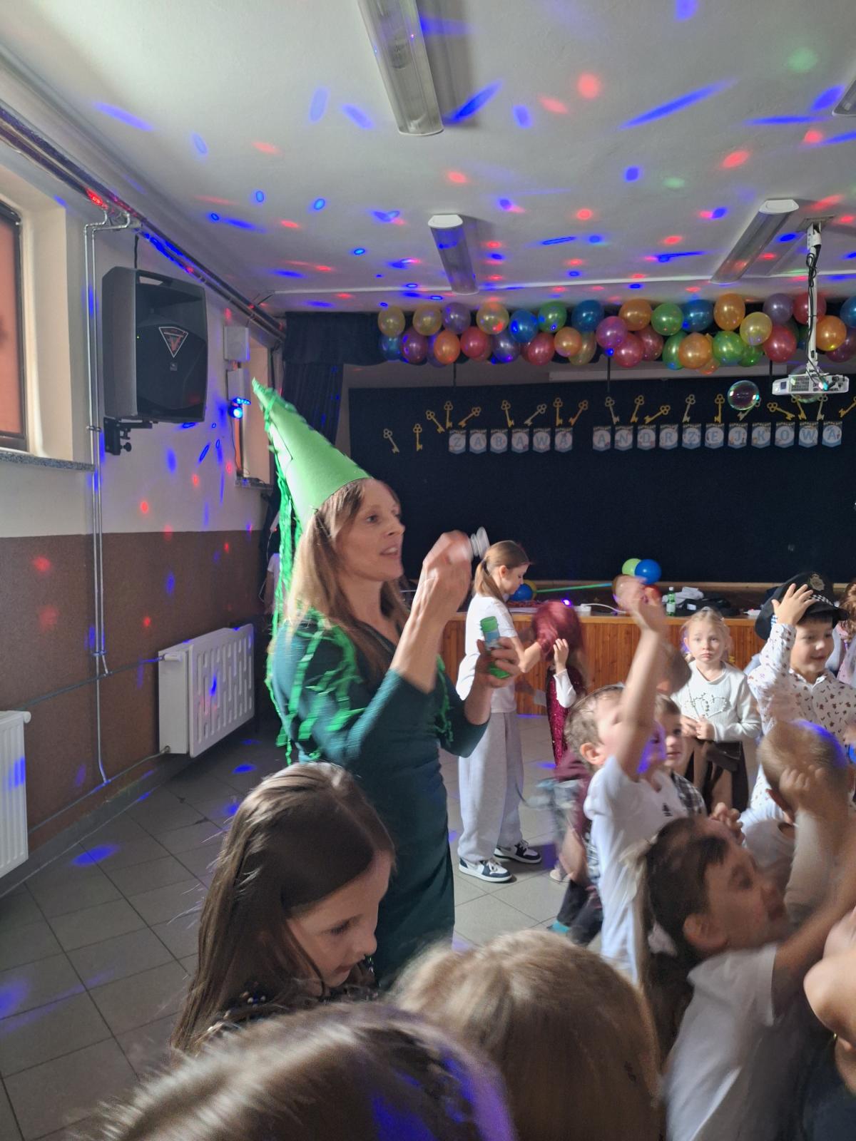 Natomiast drugą częścią imprezy była wspólna zabawa taneczna w sali świetlicy, którą wspaniale przygotowała i przeprowadziła pani Katarzyna Grzybowska, nauczyciel wychowania fizycznego, która tego dnia wcieliła się w tajemniczą ,,zieloną wróżkę”. Jej energia i pomysłowość sprawiły, że dzieci chętnie uczestniczyły w tańcach i zabawach, w których również nie zabrakło motywu przepowiadania przyszłości. O świetną muzykę zadbali przedstawiciele Samorządu Uczniowskiego.