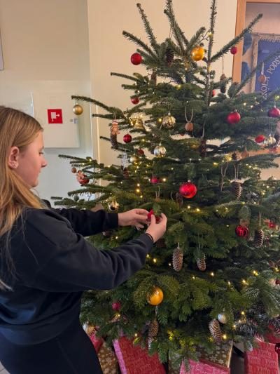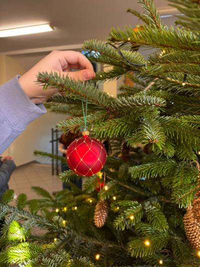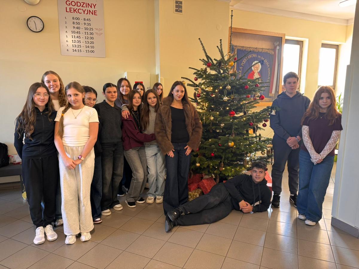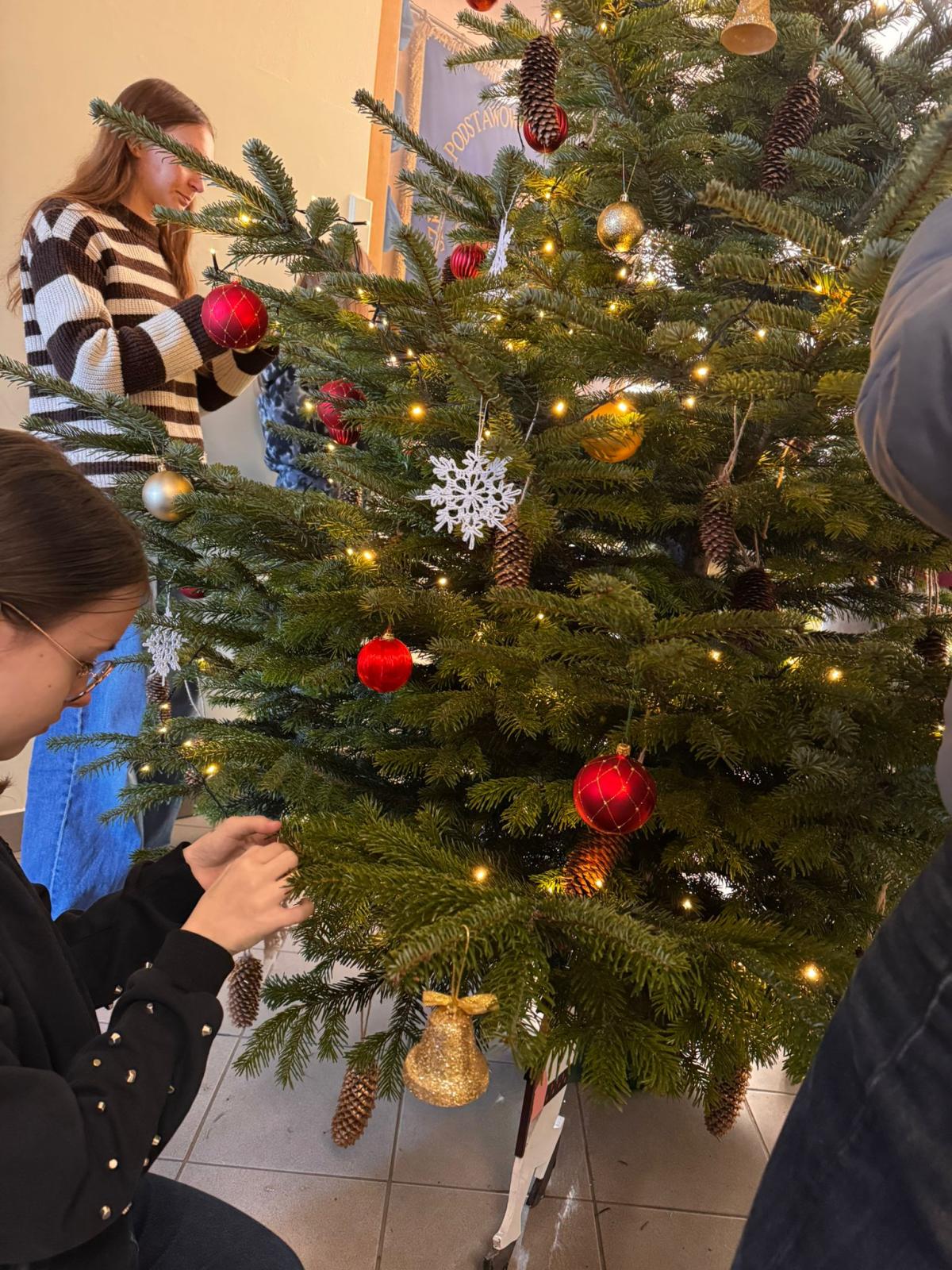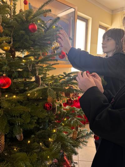 Przygotowania do Świąt Bożego Narodzenia rozpoczęliśmy od najważniejszego symbolu – choinki. Dzięki zaangażowaniu uczniów ze Samorządu, nasze drzewko zostało pięknie udekorowane i dumnie prezentuje się, wprowadzając nas wszystkich w świąteczny nastrój.