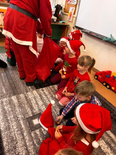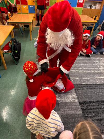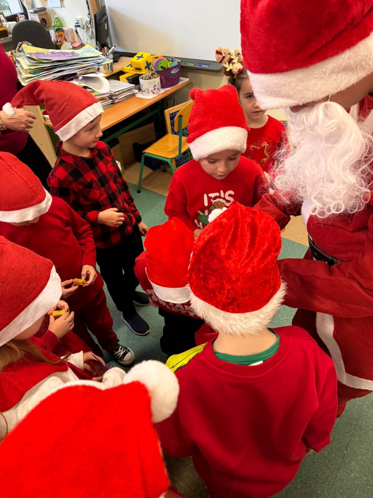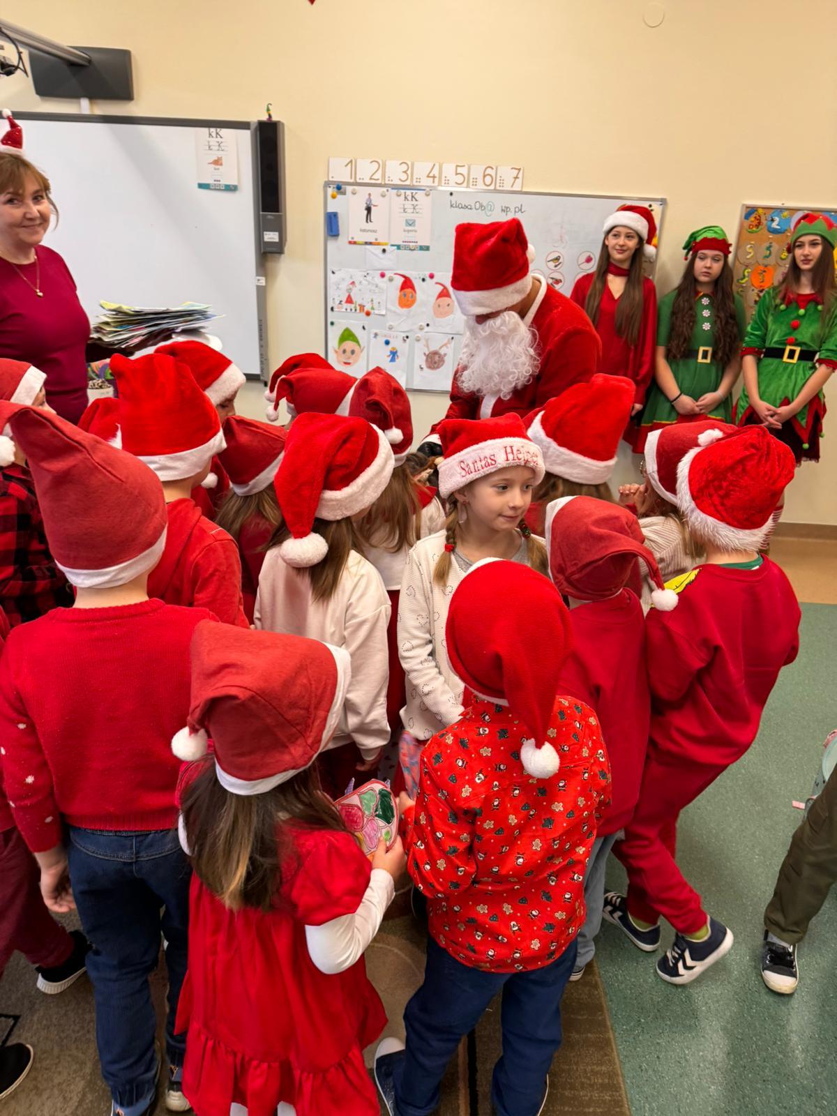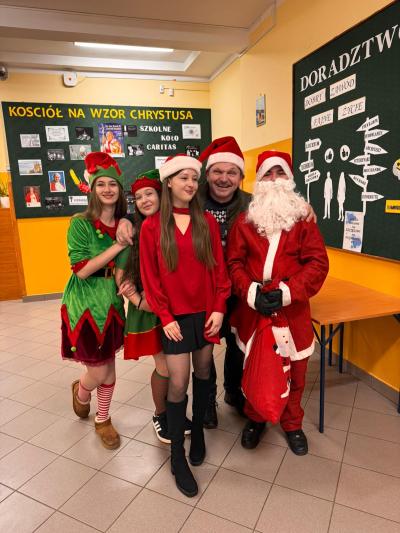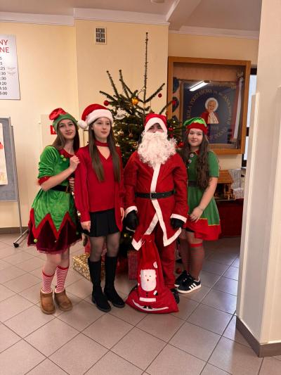 To jednak nie koniec niespodzianek przygotowanych przez naszych uczniów. 5 grudnia szkołę odwiedził wyjątkowy gość. Był to Samorządowy Święty Mikołaj, który przybył w doborowym towarzystwie. Mikołajowi towarzyszyła urocza Pani Mikołajowa oraz pracowite Elfy. Ta wesoła delegacja Samorządu Uczniowskiego odwiedziła uczniów, nauczycieli i pracowników szkoły, częstując cukierkami.