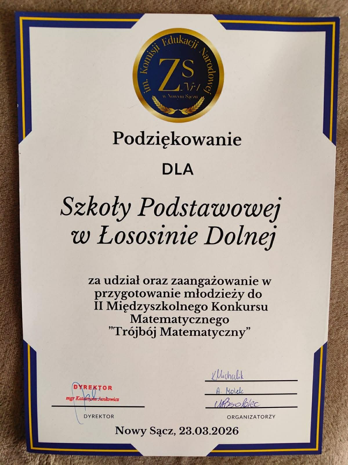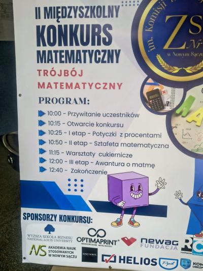 W dniu 23 marca 2026 odbył się w ZSP nr w Nowym Sączu, międzyszkolny konkurs matematyczny pod nazwą „Trójbój matematyczny”, w którym naszą szkołę reprezentowało troje uczniów klasy ósmej: Karolina Drewko, Arkadiusz Duda oraz Piotr Lebda.